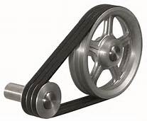 Vee belts (also known as V-belt or wedge rope) solved the slippage and alignment problem. It is now the basic belt for power transmission. They provide the best combination of traction, speed of movement, load of the bearings, and long service life. The V-belt was developed in 1917 by John Gates of the Gates Rubber Company. They are generally endless, and their general cross-section shape is trapezoidal. The “V” shape of the belt tracks in a mating groove in the pulley (or sheave), with the result that the belt cannot slip off. The belt also tends to wedge into the groove as the load increases — the greater the load, the greater the wedging action — improving torque transmission and making the V-belt an effective solution, needing less width and tension than flat belts. V-belts trump flat belts with their small center distances and high reduction ratios. The preferred center distance is larger than the largest pulley diameter, but less than three times the sum of both pulleys. Optimal speed range is 1000–7000 ft/min. V-belts need larger pulleys for their larger thickness than flat belts. They can be supplied at various fixed lengths or as a segmented section, where the segments are linked (spliced) to form a belt of the required length. For high-power requirements, two or more vee belts can be joined side-by-side in an arrangement called a multi-V, running on matching multi-groove sheaves. The strength of these belts is obtained by reinforcements with fibers like steel, polyester or aramid (e.g. Twaron or Kevlar). This is known as a multiple-V-belt drive (or sometimes a “classical V-belt drive”). When an endless belt does not fit the need, jointed and link V-belts may be employed. However they are weaker and only usable at speeds up to 4000 ft/min. A link v-belt is a number of rubberized fabric links held together by metal fasteners. They are length adjustable by disassembling and removing links when needed.